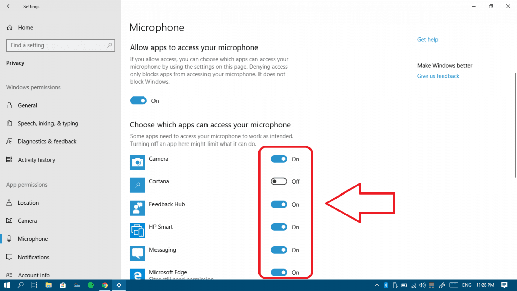 Finally in the app list, make sure to turn on microphone access for Chrome you want to give permission to access your microphone.